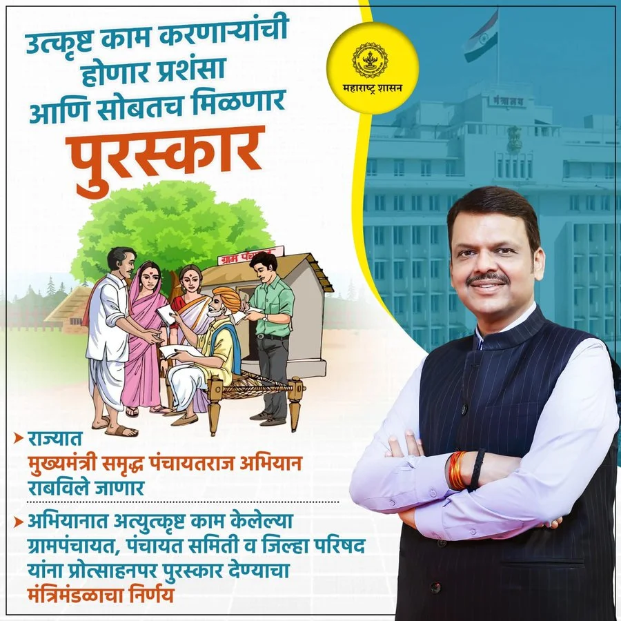 पार्श्वभूमी:-राज्य शासनाच्या ग्रामविकास विभागाने “मुख्यमंत्री समृद्ध पंचायतराज अभियान” या महत्वाकांक्षी अभियानाच्या अंमलबजावणीचा निर्णय घेतला आहे. यामध्ये जिल्हा परिषद, पंचायत समिती आणि ग्रामपंचायतींना त्यांच्या कामगिरीनुसार प्रोत्साहित करून त्यांची कार्यक्षमता वाढविणे, त्यांना स्पर्धात्मक वातावरणातून नवीन उर्जा देणे, शासकीय योजनांची प्रभावी अंमलबजावणी करणे, योजनांचा लाभ ग्रामीण भागातील शेवटच्या घटकापर्यंत पोहोचविणे व त्यातून ग्रामीण भागातील लोकांचे जीवनमान उंचावणे या उद्देशाने ही योजना तयार करण्यात आली आहे. ग्रामपंचायतींमध्ये लोकसहभागाची चळवळ निर्माण करणे, ग्रामीण नागरिकांना सुलभ रीतीने सेवा देणे, आरोग्य, शिक्षण, उपजीविका, सामाजिक न्याय या क्षेत्रांमध्ये ग्रामपंचायतींचा सहभाग वाढविणे, यासाठी सन २०२५-२६ या आर्थिक वर्षापासून “मुख्यमंत्री समृद्ध पंचायतराज अभियान” राबविण्यात येणार आहे.